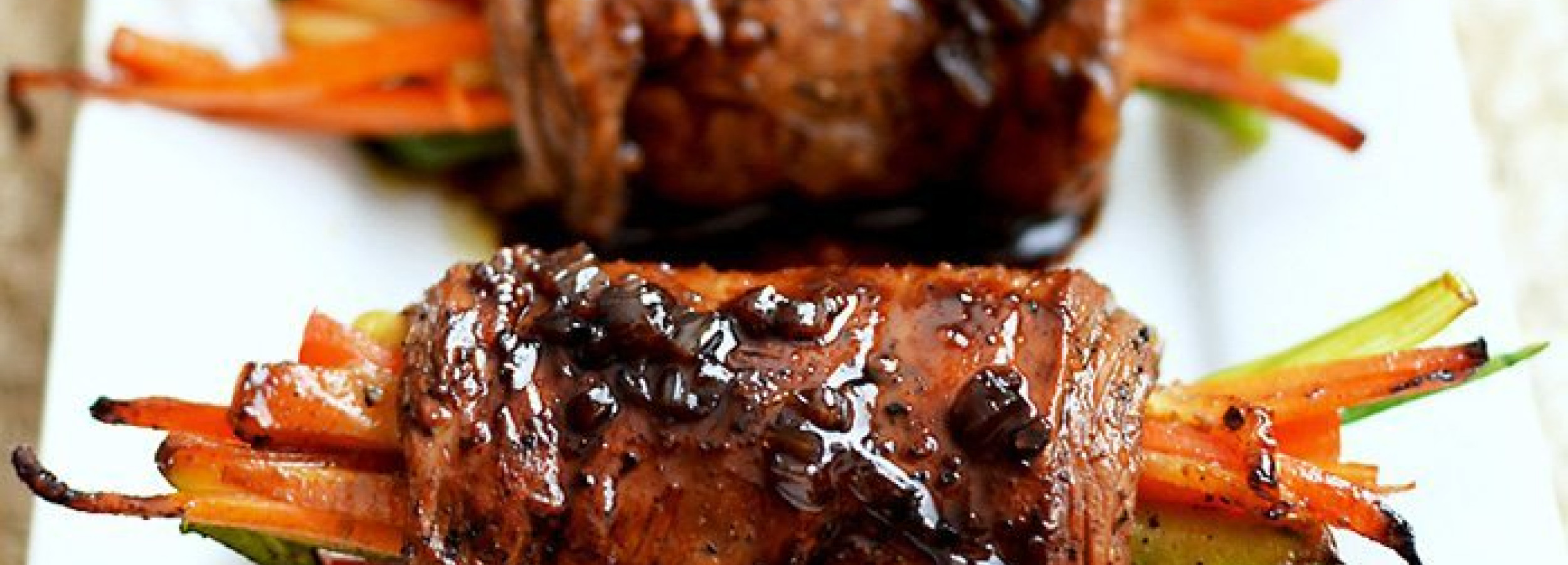 - To assemble the steak rolls, simply take a strip of the marinated steak and lay it with the short side towards you. Place the veggies (including the green onion) in the middle and roll the beef up over the filling, securing it with a toothpick.