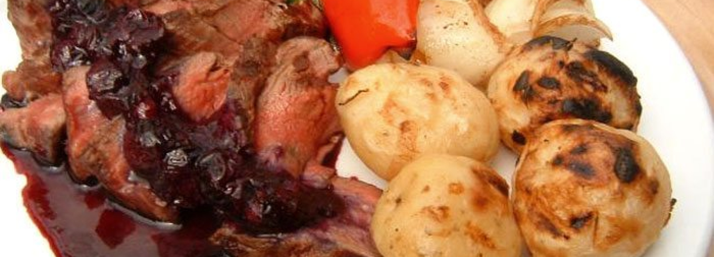 - Spoon 2-3 oz. of blueberry reduction on plate.