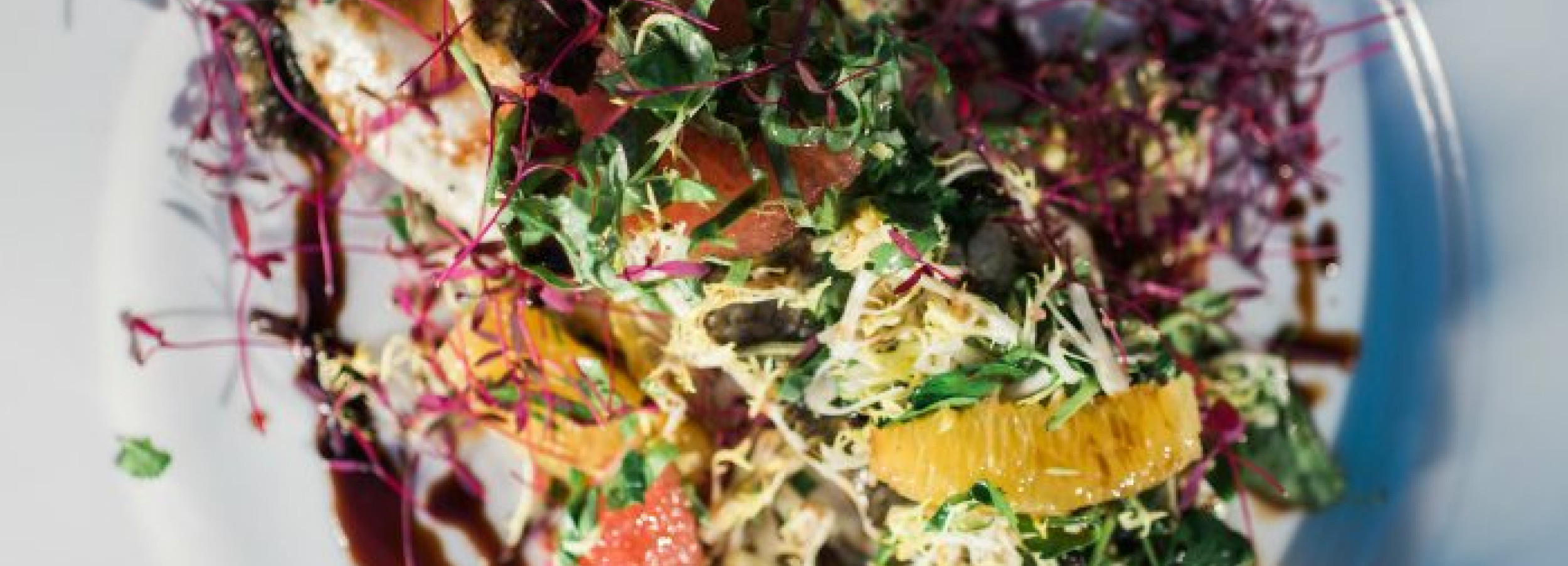 - Remove the fish from the griddle, place on a serving plate, top with the greens and the citrus segments. Add one last pinch of pepper, a drizzle of EVOO and a drizzle of blood orange vinegar.