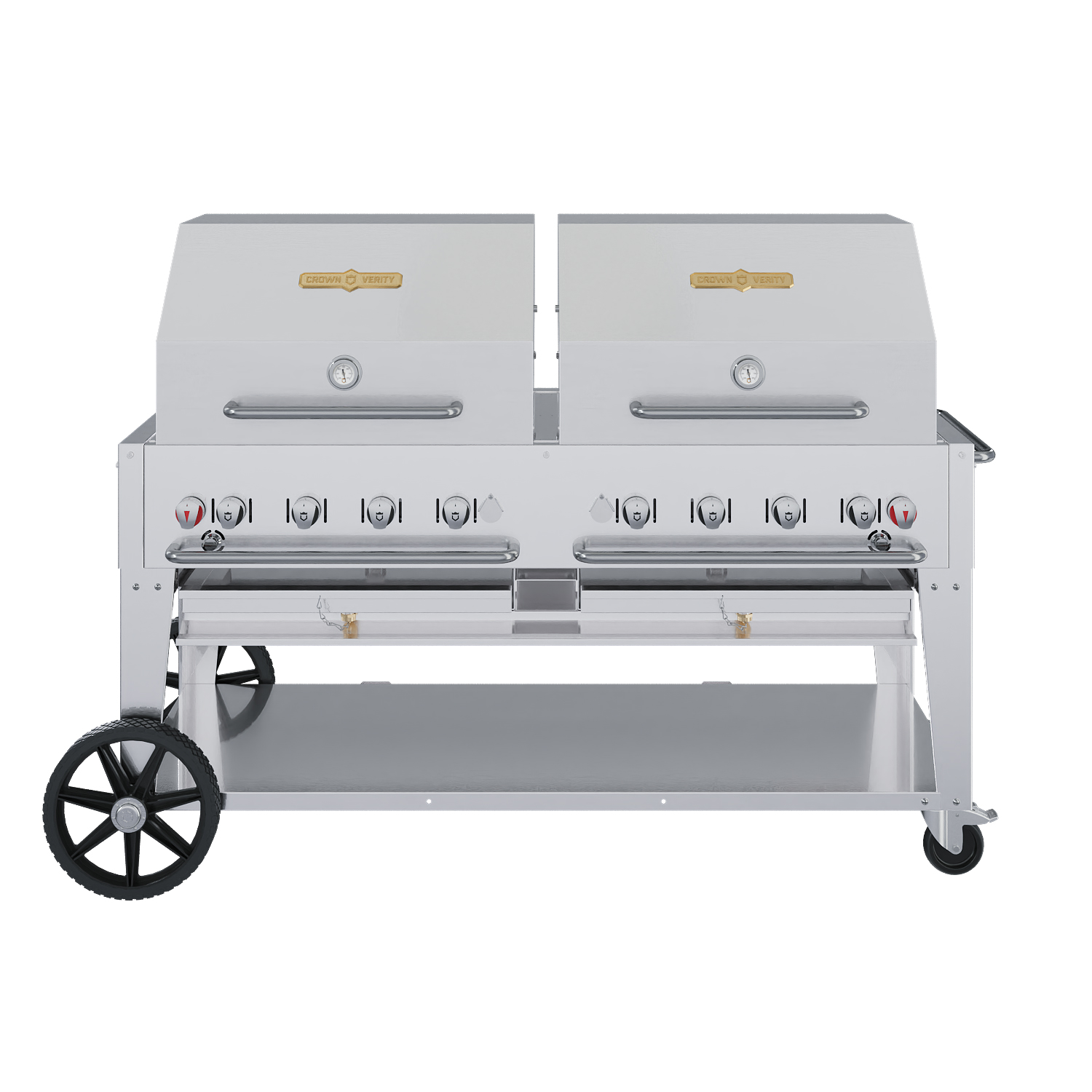 Designed with versatility in mind, this grill is a favourite among high-volume caterers, golf clubs, and hotels. Pictures shown are for illustration purposes only. Actual product may vary due to product enhancement. Includes two 30" roll domes, bun rack, and BBQ cover.